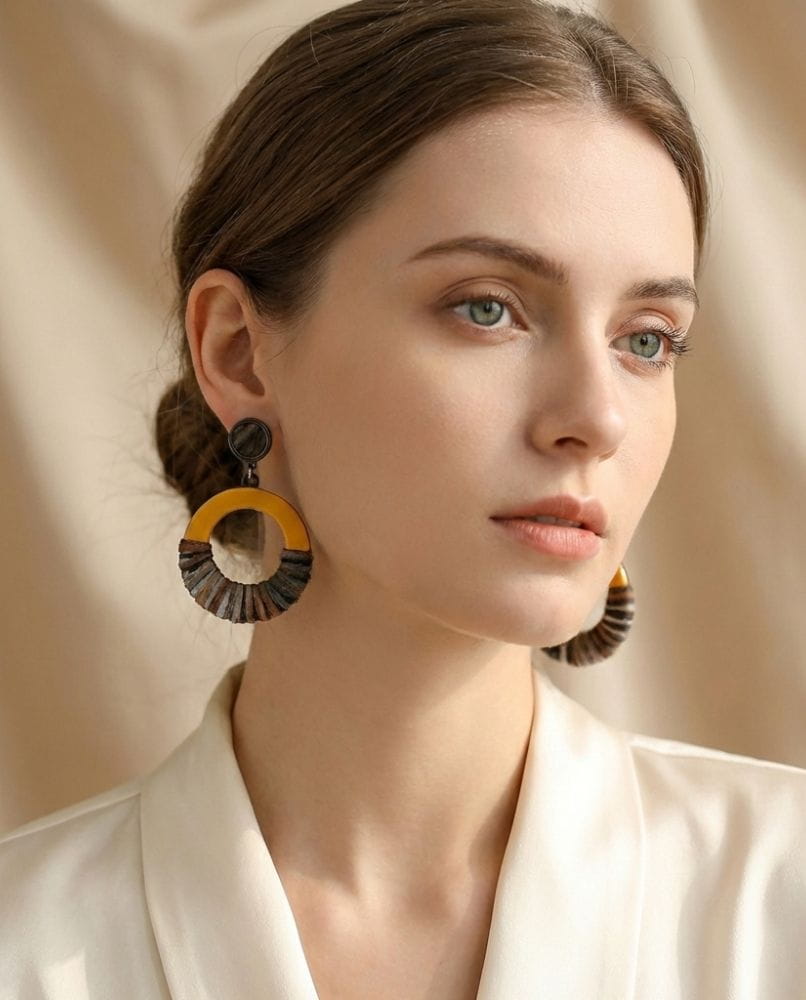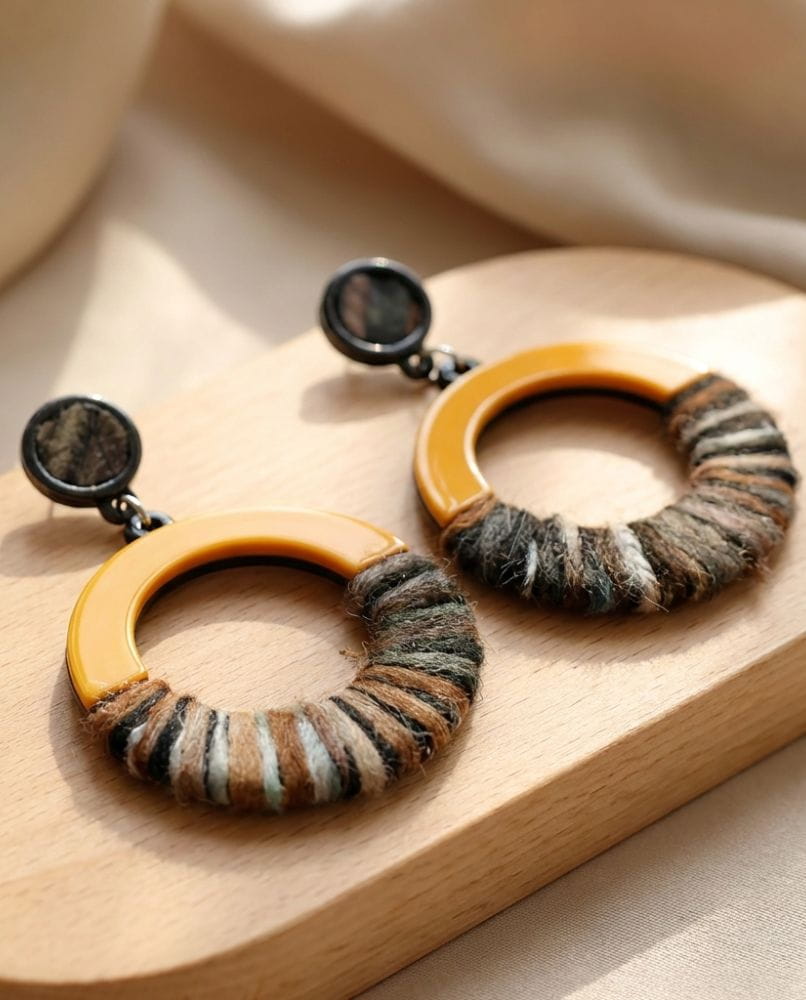 Te kolczyki to kunsztowne połączenie faktur. Energetyzujący, gładki element w kolorze nasyconej musztardy symbolizuje słońce i optymizm, podczas gdy dół, misternie opleciony miękką przędzą w barwach ziemi, nadaje im etnicznego, niemal rzemieślniczego charakteru.