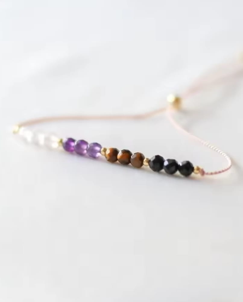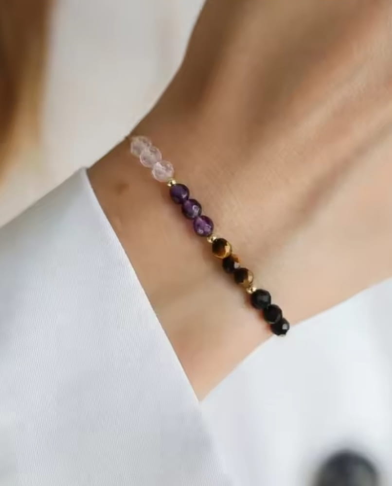 Bransoletka z naturalnych kamieni – Kwarc Różowy, Ametyst, Tygrysie Oko i Czarny Turmalin