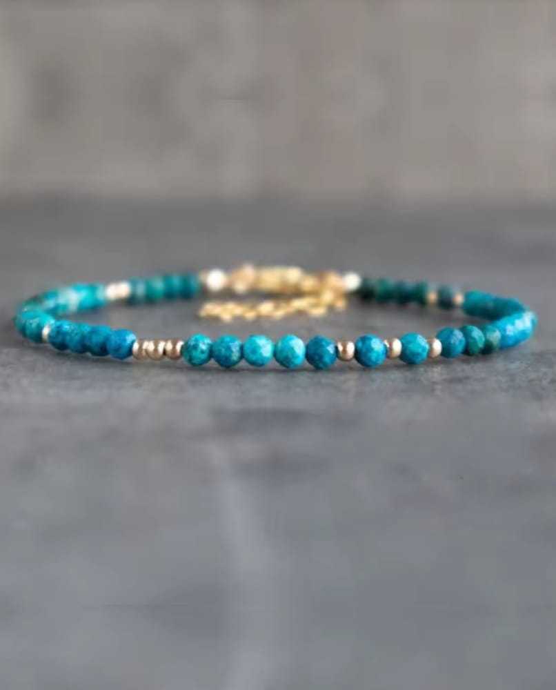 Przenieś się w świat spokoju, harmonii i naturalnego piękna z naszą ręcznie robioną bransoletką z kamieni półszlachetnych. Lśniące koraliki z afrykańskiego turkusu w odcieniach morskiej głębi, przeplatane złotymi akcentami, tworzą niezwykle kobiecą i stylową kompozycję.
