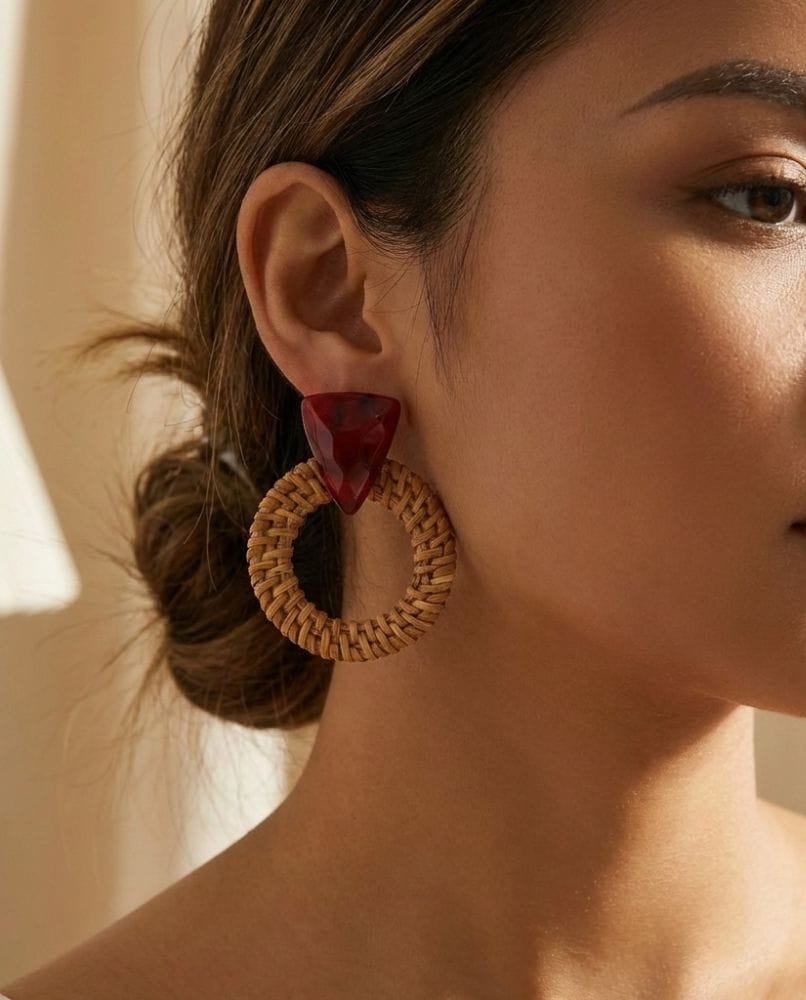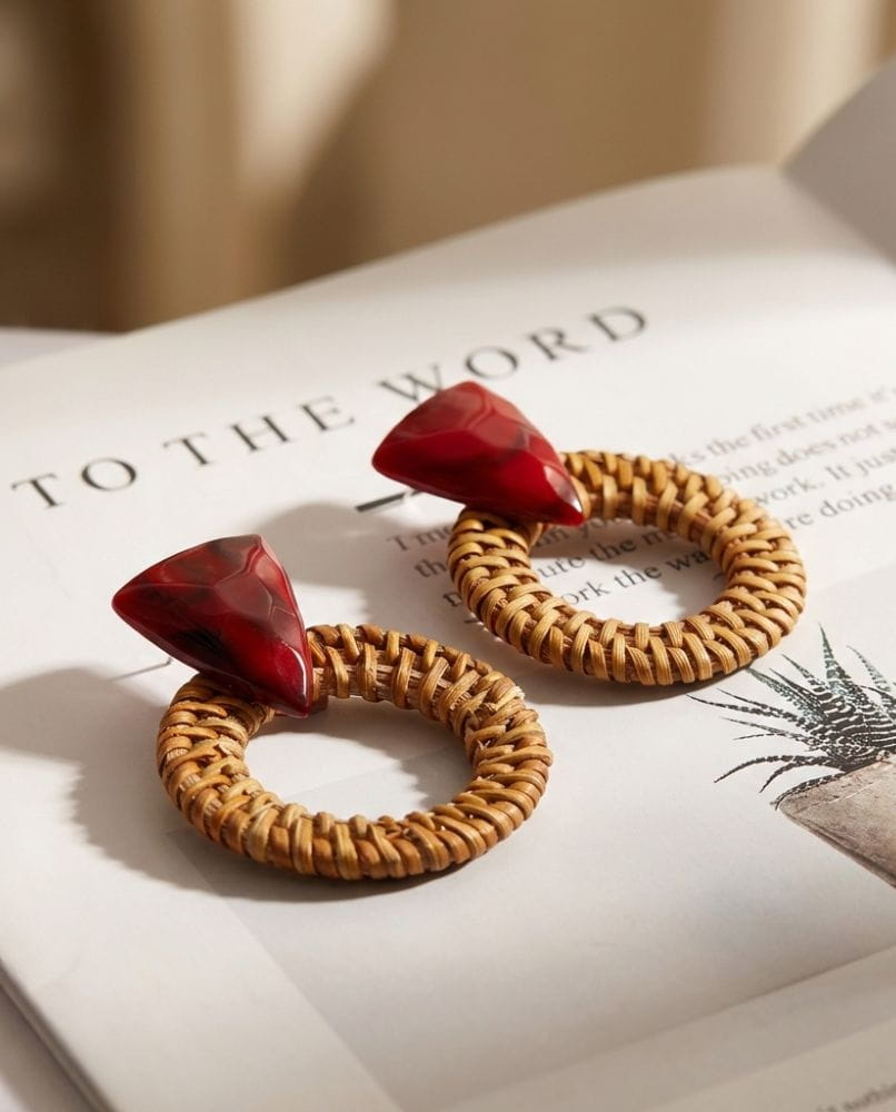 Egzotyczna Elegancja: Kolczyki Rattanowe z Bordowym Drewnianym Akcentem