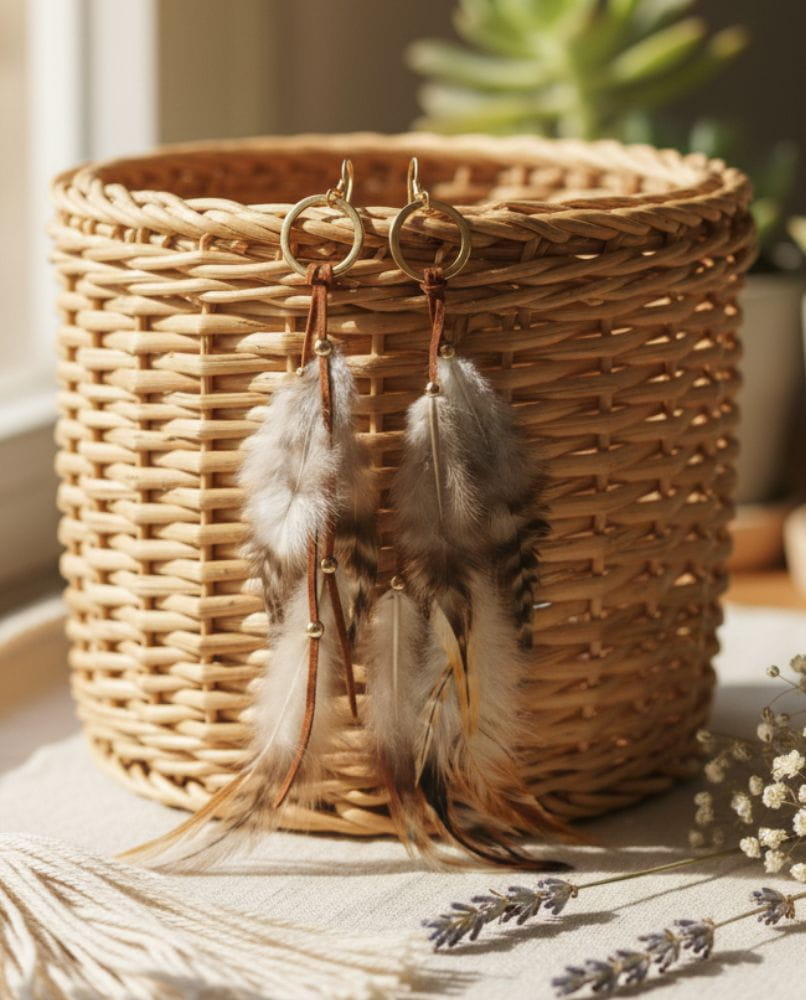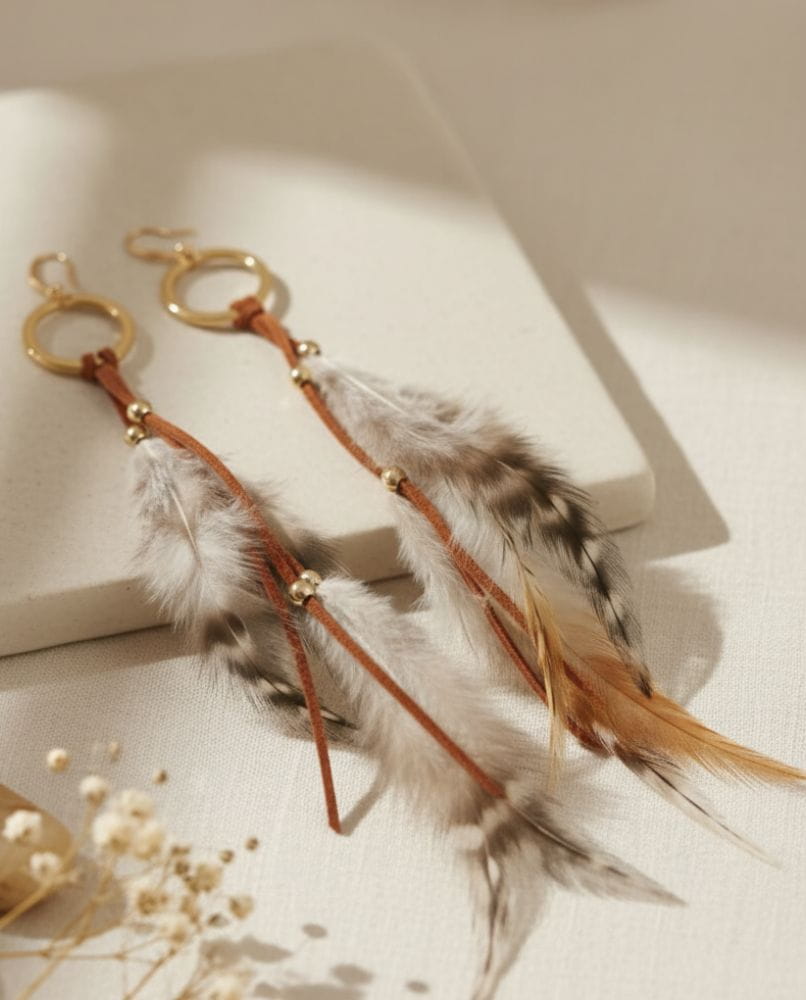 - Złote Akcenty i Kółka: Elegancję kolczyków podkreślają drobne, złote koraliki dyskretnie wplecione w rzemień, oraz minimalistyczne, złote kółka, które stanowią bazę dla piór. Te detale dodają kolczykom blasku i sprawiają, że idealnie pasują zarówno do codziennych, jak i bardziej swobodnych, festiwalowych stylizacji.