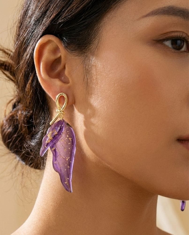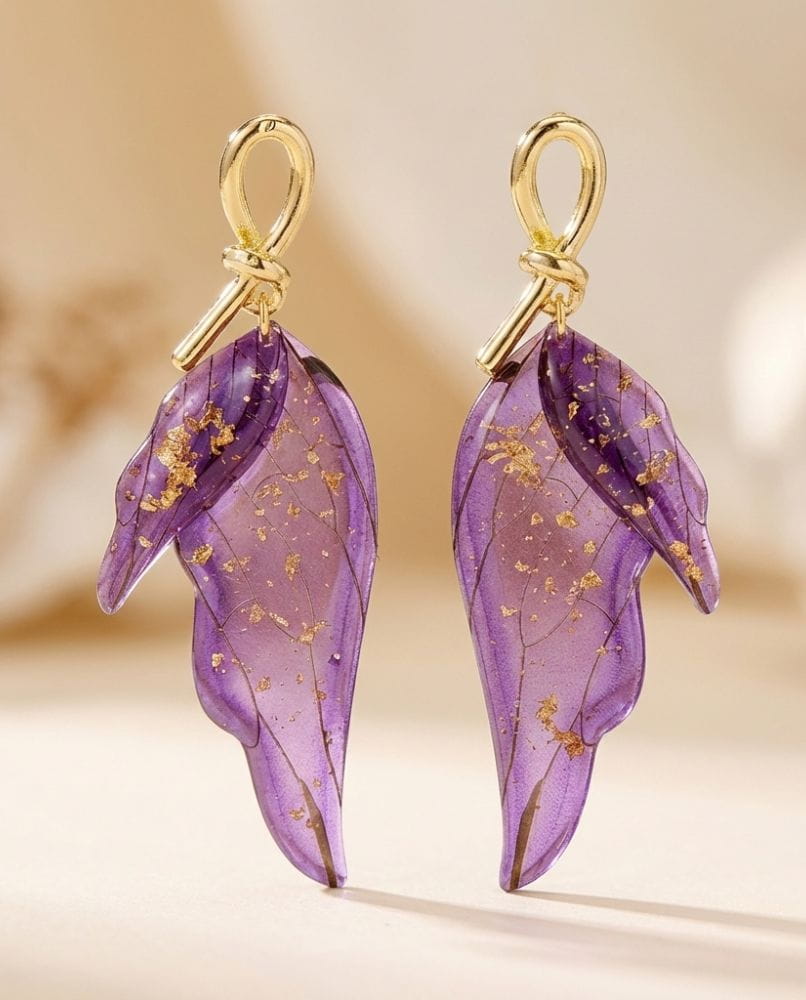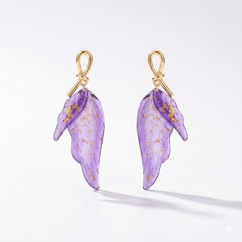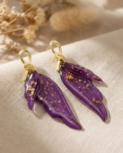 Zatopione drobinki prawdziwego blasku – Głęboki, fioletowy odcień żywicy został wzbogacony o płatki złota, które przepięknie pracują ze światłem. Każda para jest unikatowa – nie ma dwóch identycznych skrzydeł, dokładnie tak jak w naturze.