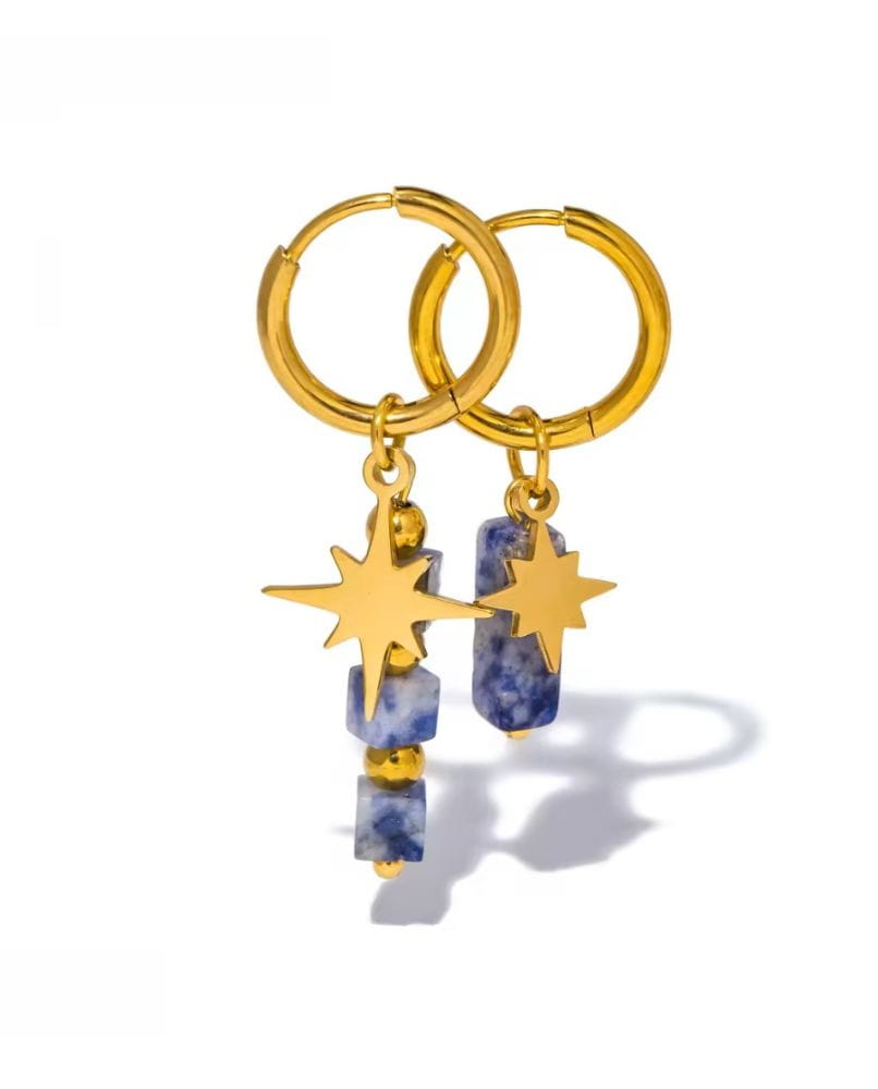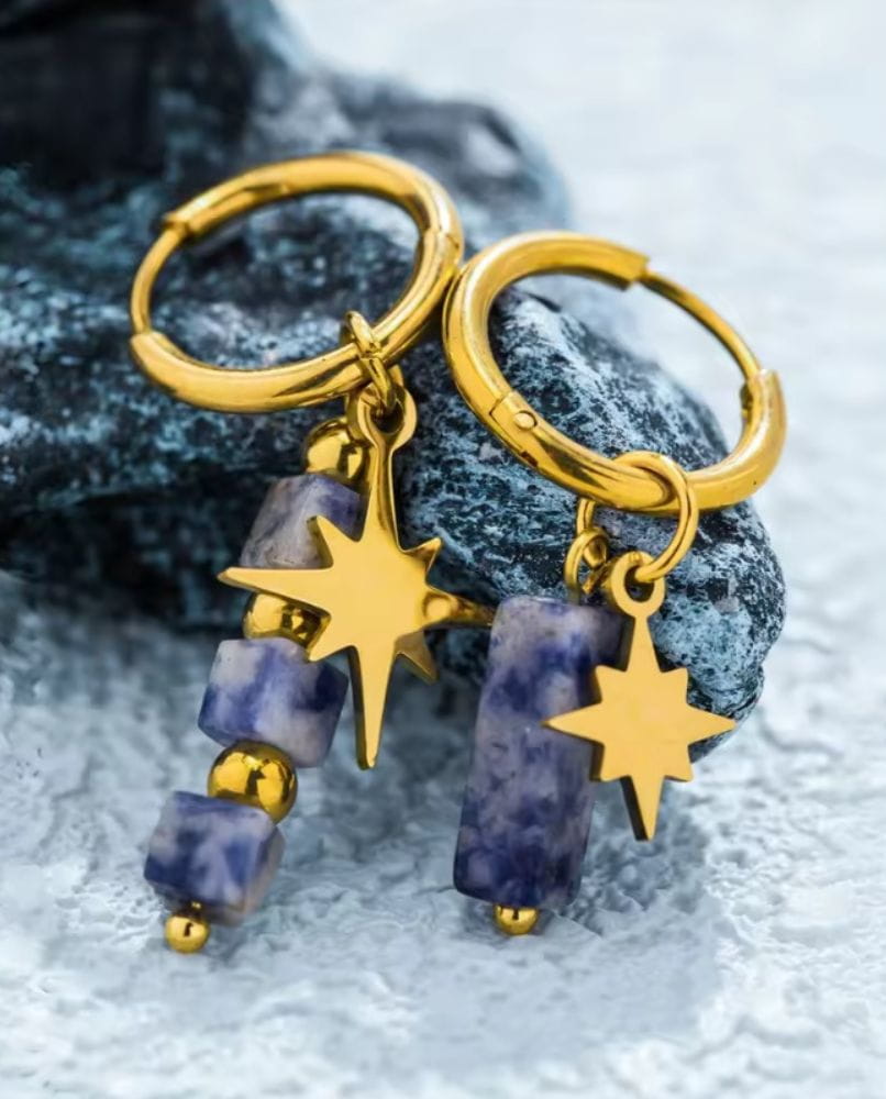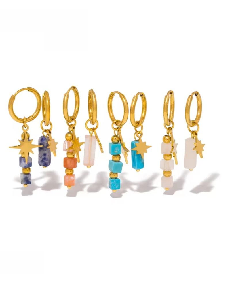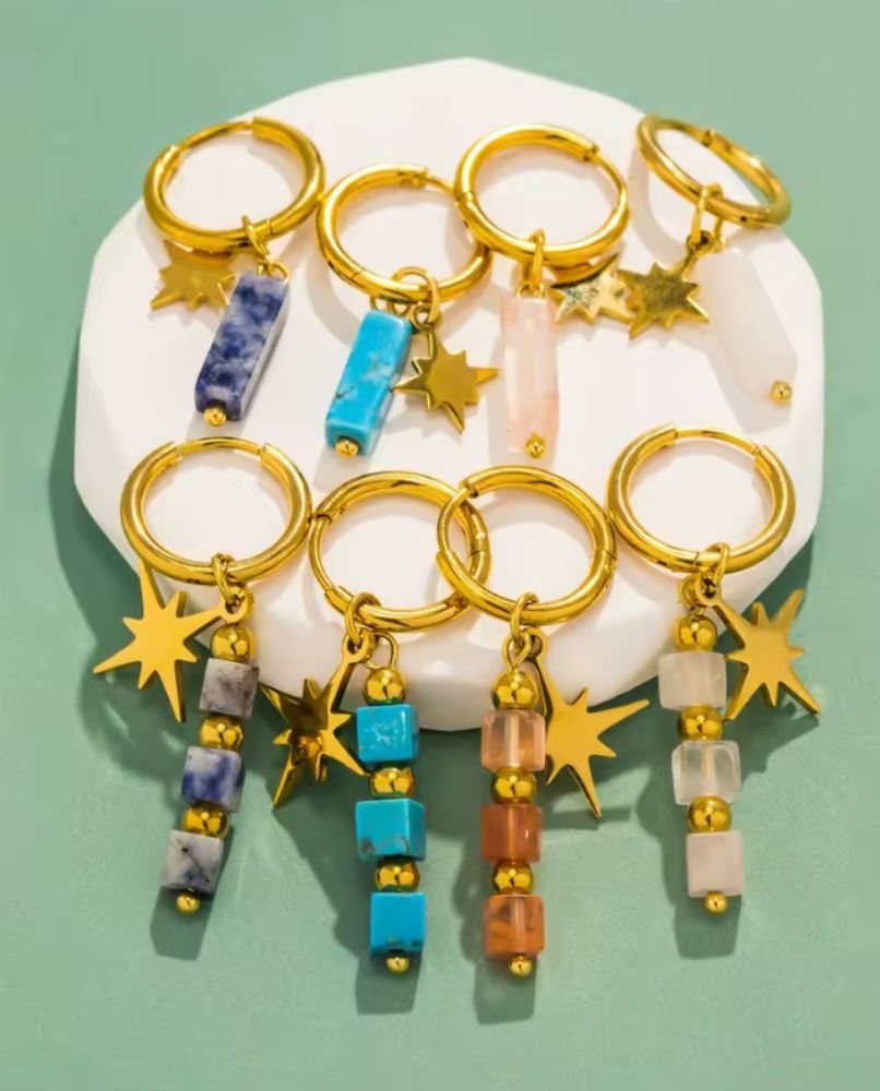 Te kolczyki to coś więcej niż ozdoba. To manifest stylu, indywidualności i odwagi, by błyszczeć – niezależnie od okazji. Wykonane ze stali szlachetnej pozłacanej 18-karatowym złotem i ozdobione naturalnymi kamieniami, są niczym talizmany, które przyciągają uwagę i podkreślają Twoje wyjątkowe piękno.