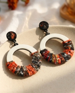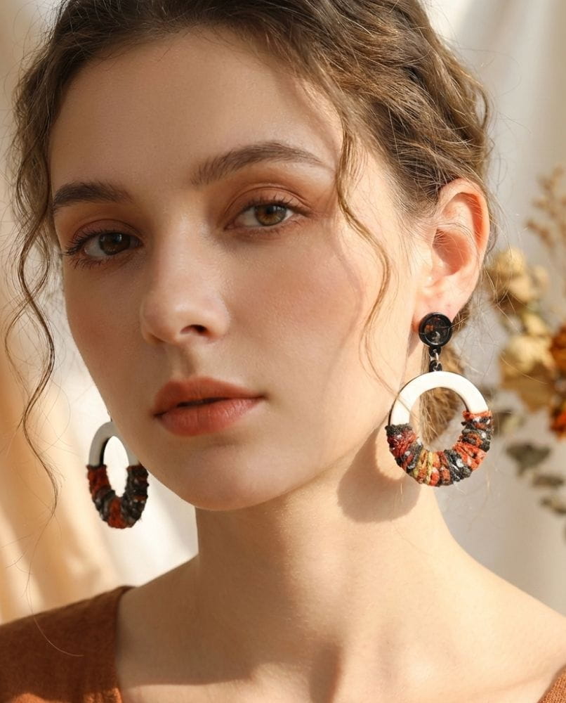 Jesienny Cozy Look: Zestaw je z grubym, mięsistym swetrem w kolorze ecru lub karmelu. Tekstura włóczki na kolczykach idealnie „zagada” z dzianiną, tworząc spójny, ciepły wizerunek.