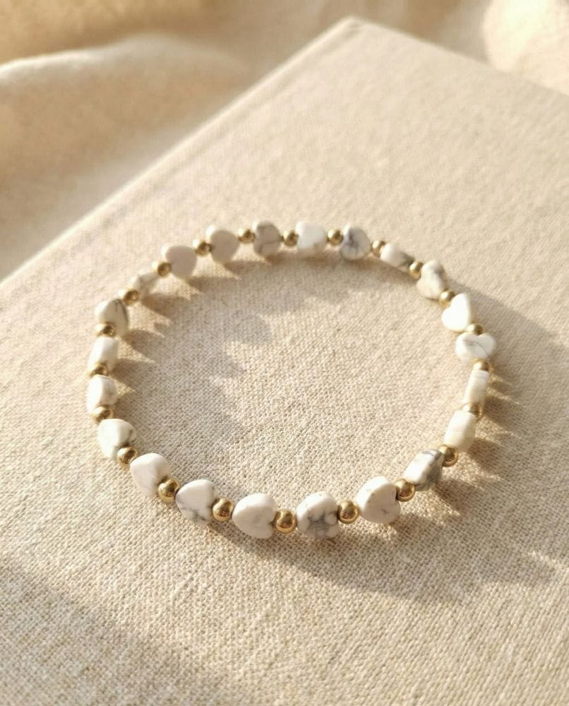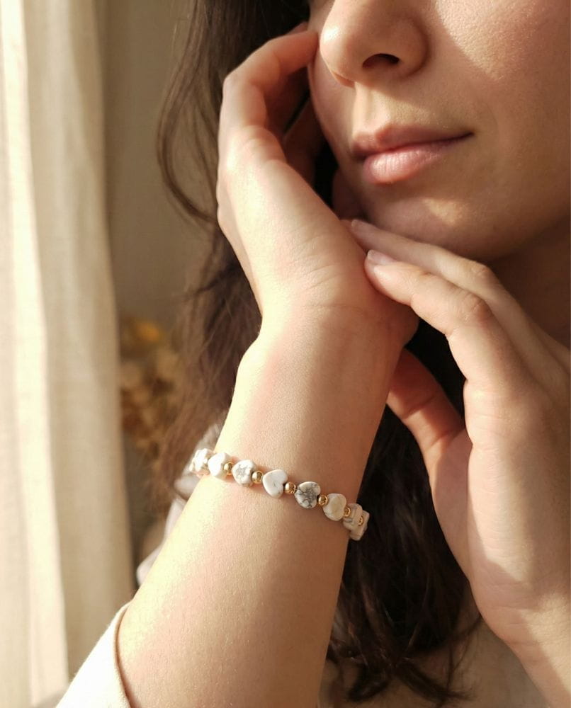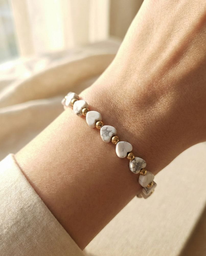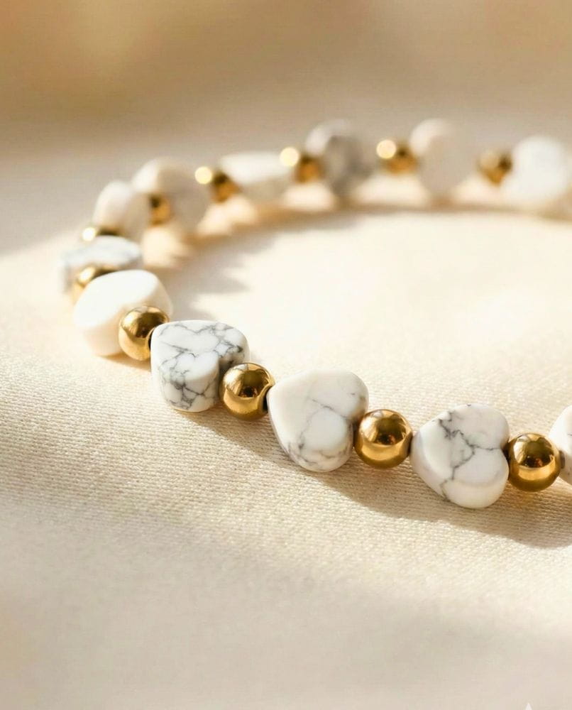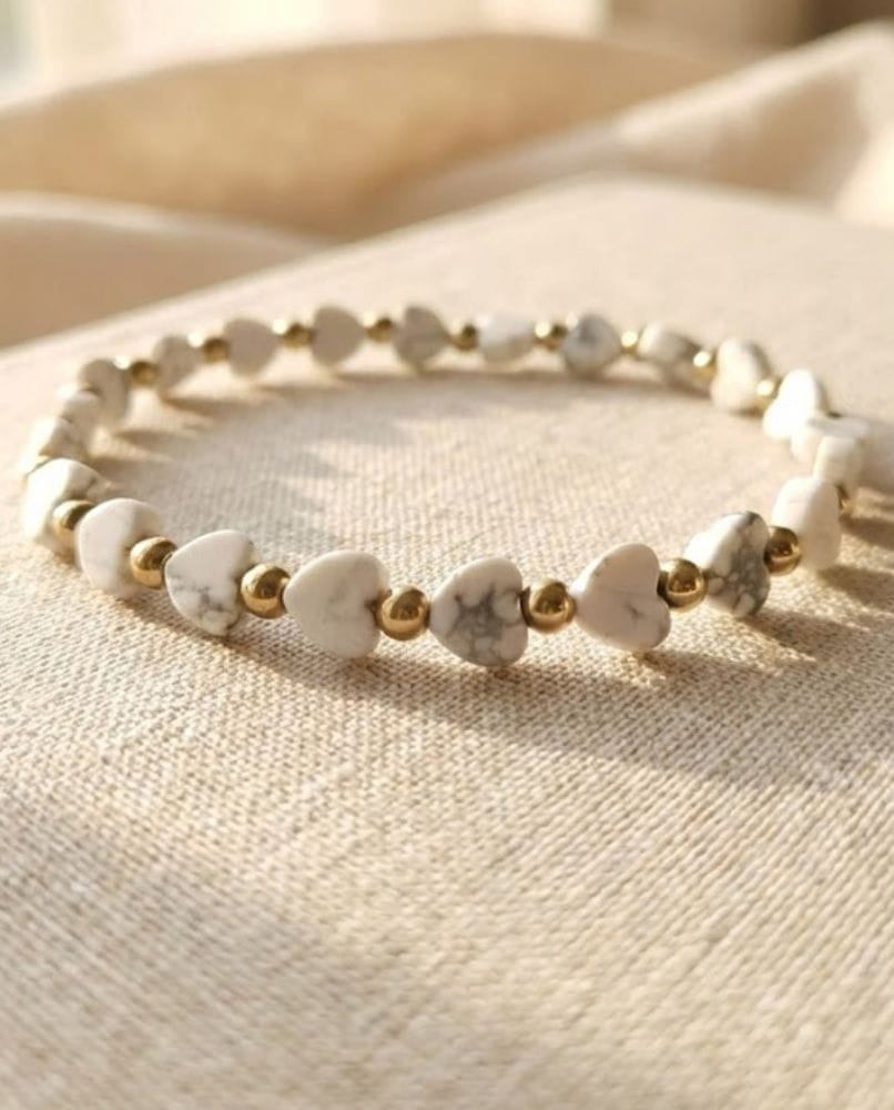 Czy szukasz dodatku, który nie tylko dopełni Twoją stylizację, ale też stanie się Twoim osobistym talizmanem spokoju? Przedstawiamy bransoletkę Pure Love – wyjątkowe połączenie naturalnego białego howlitu w kształcie serc oraz szlachetnego blasku pozłacanej stali.