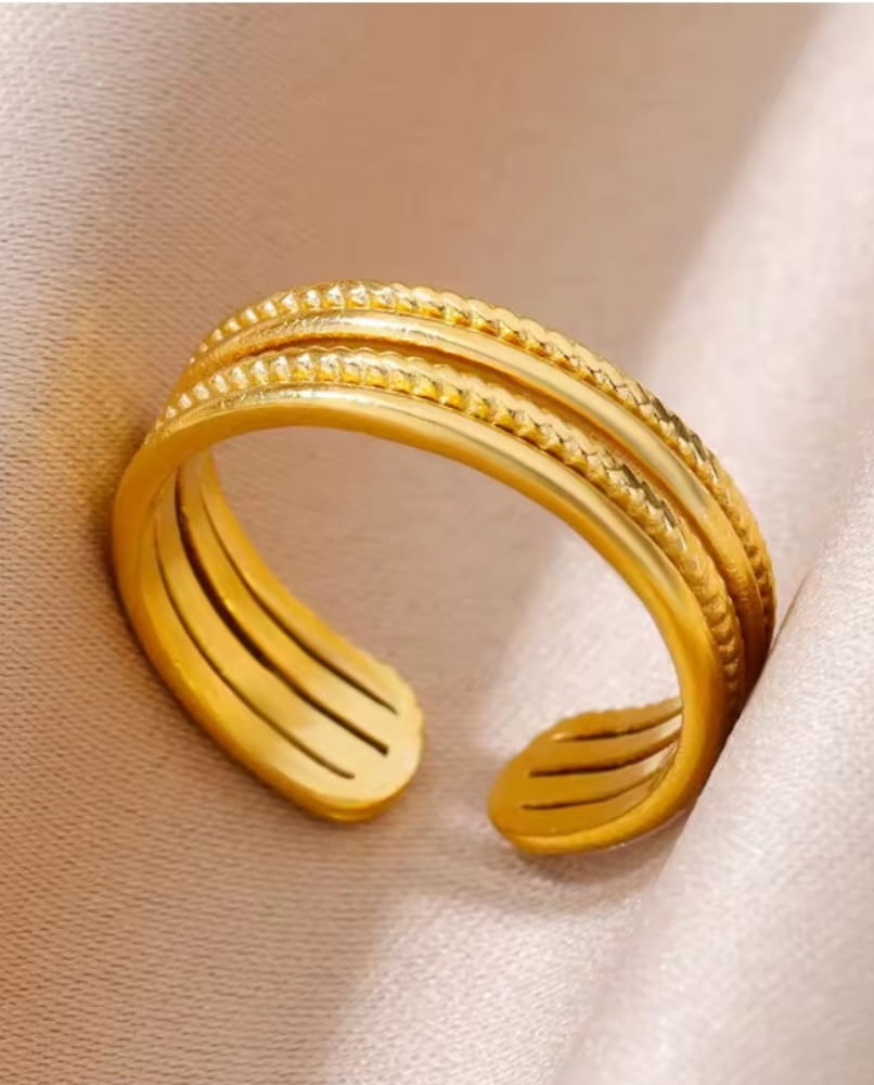 Ten wyjątkowy pierścionek wykonany ze stali szlachetnej pokrytej 18-karatowym złotem to kwintesencja elegancji i nowoczesnego stylu. Subtelne żłobienia i delikatnie zdobione wykończenia sprawiają, że emanuje on luksusem, który idealnie dopełni każdą stylizację – od codziennych po najbardziej wyjątkowe okazje.