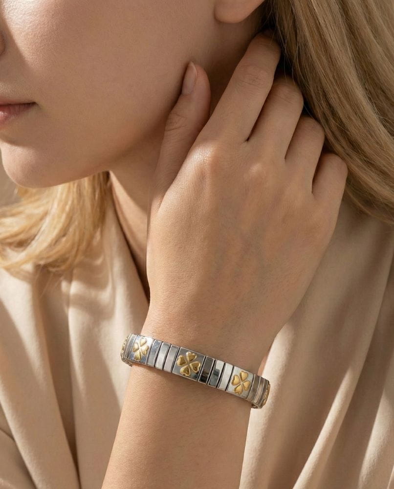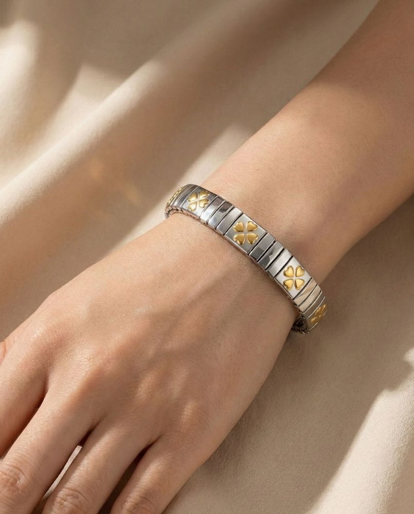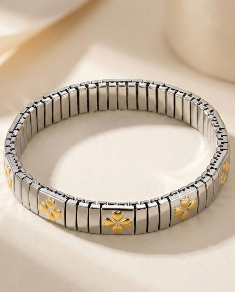 Design, który przyciąga spojrzenia: Połączenie chłodnego blasku szlachetnej stali z ciepłym odcieniem złota tworzy luksusowy kontrast. Subtelne serca ułożone w koniczynkę sprawiają, że bransoletka wygląda lekko, kobieco i niezwykle elegancko.