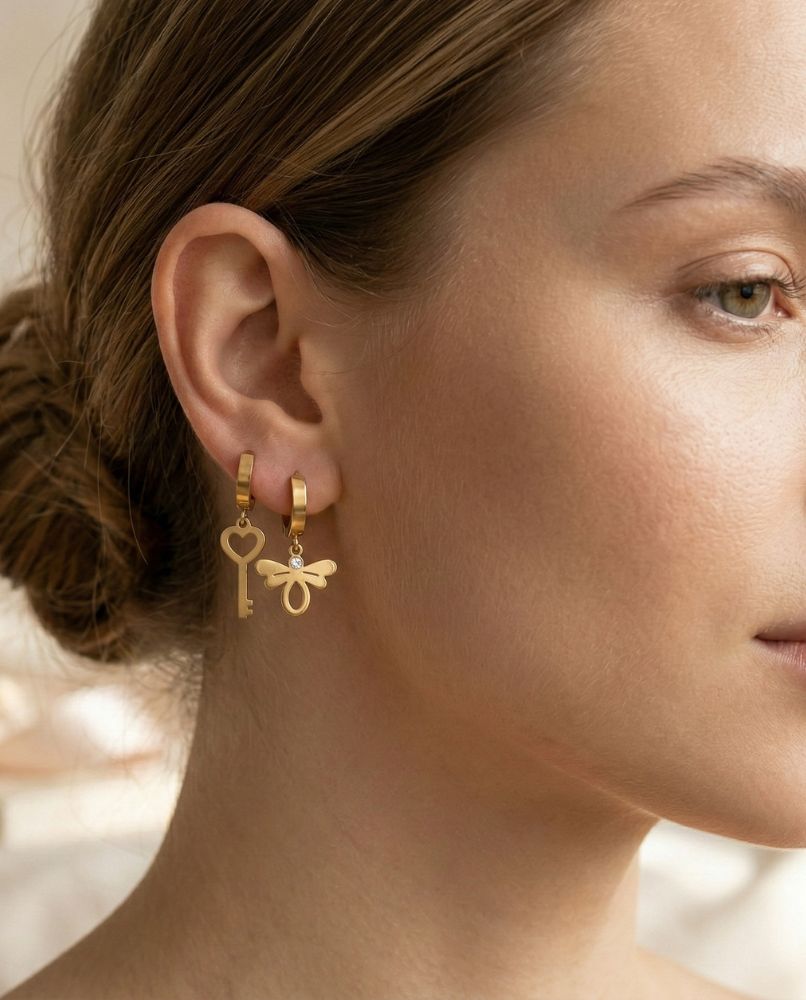 Na Drugim Uchu: Natura i Odrodzenie. Stylizowana, pozłacana pszczoła (lub motyl, interpretacja należy do Ciebie), ozdobiona subtelnie błyszczącym kryształkiem (diamentem) w centrum. To symbol pracowitości, harmonii i wolności, gotowy, by dodać Ci pewności siebie każdego dnia.