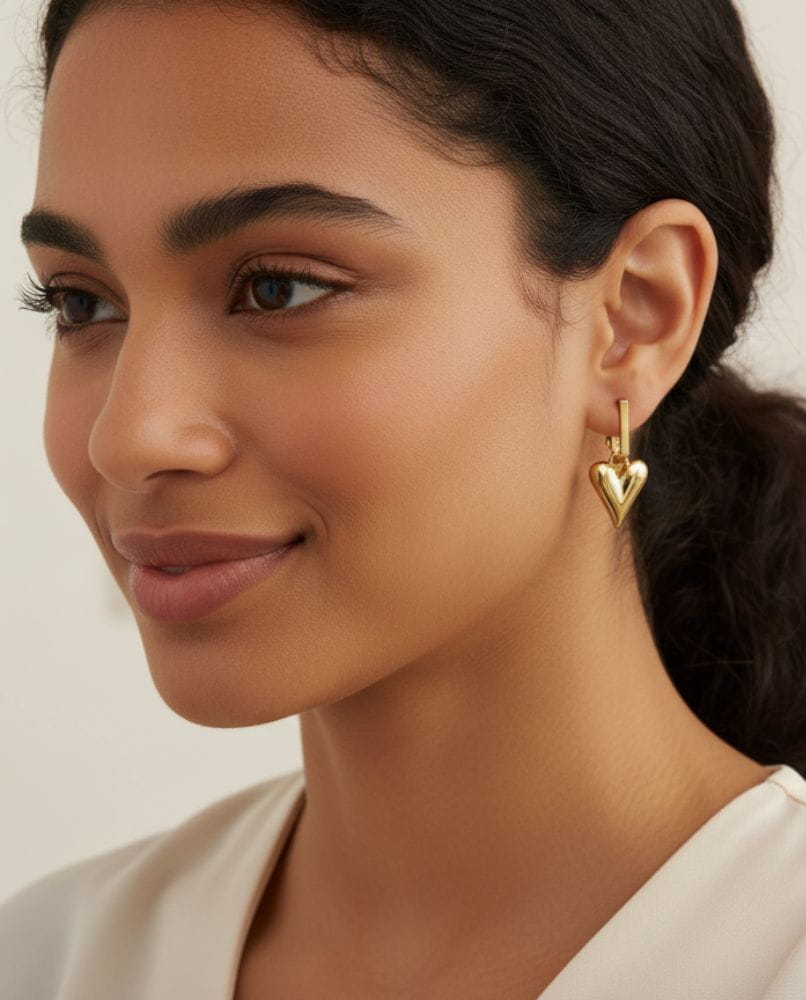 Czy szukasz biżuterii, która jest równie wyrazista, co subtelna? Nasze pozłacane kolczyki z motywem serca to manifest współczesnej kobiecości. Połączenie geometrycznej formy z miękką linią serca tworzy projekt, który przyciąga spojrzenia, ale nie dominuje nad Twoją naturalną urodą. To biżuteria, która dodaje pewności siebie – od porannej kawy po wieczorne wyjście.