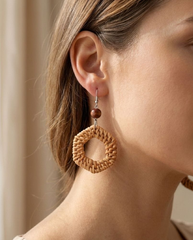 "Długość 8 cm to idealny wymiar, aby spektakularnie wysmuklić szyję. Jeśli chcesz maksymalnie wyeksponować kolczyki, upnij włosy w luźny kok lub odgarnij je za jedno ucho. Pamiętaj, że rattan kocha naturalne światło – te kolczyki najlepiej prezentują się w promieniach słońca, które podkreślają ich wielowymiarowy splot."