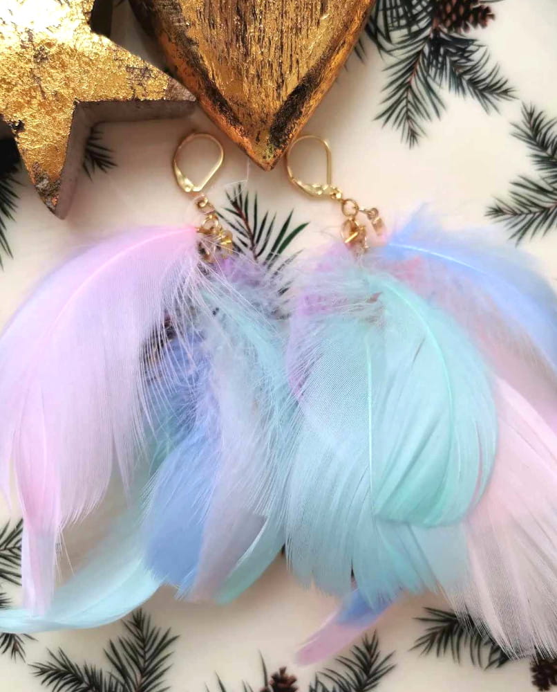 Kolczyki wykonane z piór naturalnych. Zapięcia wykonane ze stali chirurgicznej. Nie uczulają i są antyalergiczne.