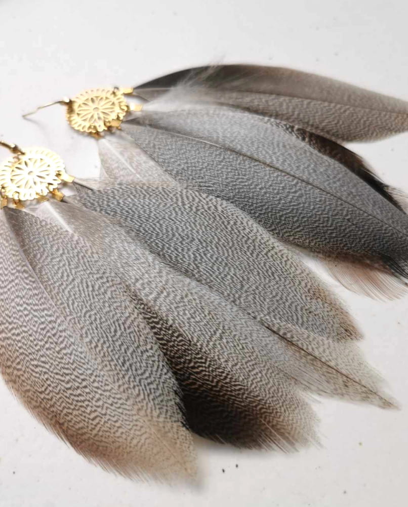 Kolczyki wykonane z piór naturalnych. Zapięcia wykonane ze stali chirurgicznej. Nie uczulają i są antyalergiczne.